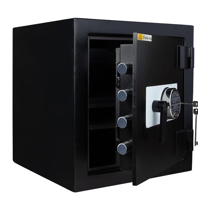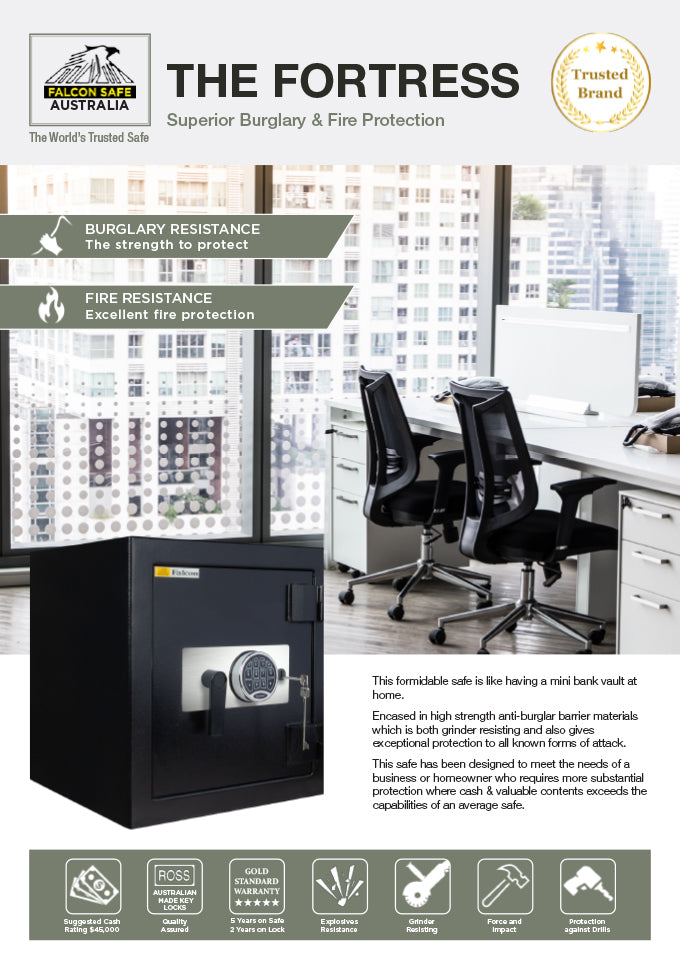 This formidable safe is like having a mini bank vault at home. Encased in anti-burglar barrier materials which are grinder resistant. It is designed to provide protection against a series of attacks using such tools as high speed grinders & drills, explosive force and other powerful cutting instruments. The Falcon Fortress safe series is ideally suited to domestic and commercial applications.