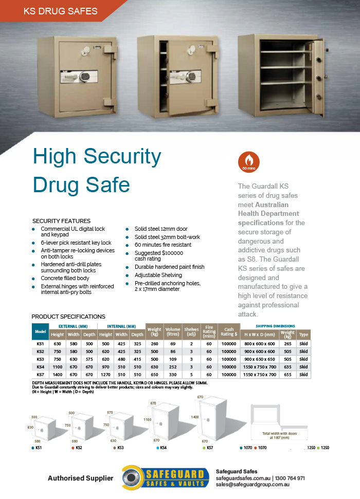 - The KS safes range complies with the Australian Medicines and Poisons Act for the storage of prescription drugs