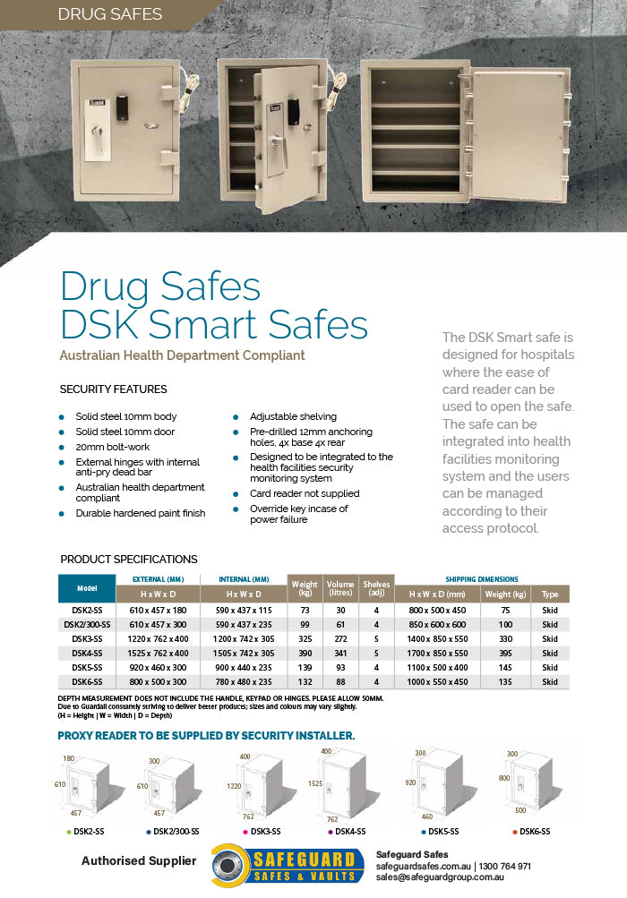 - The DSK Smart safe is designed for hospitals where the ease of a card reader can be used to open the safe.