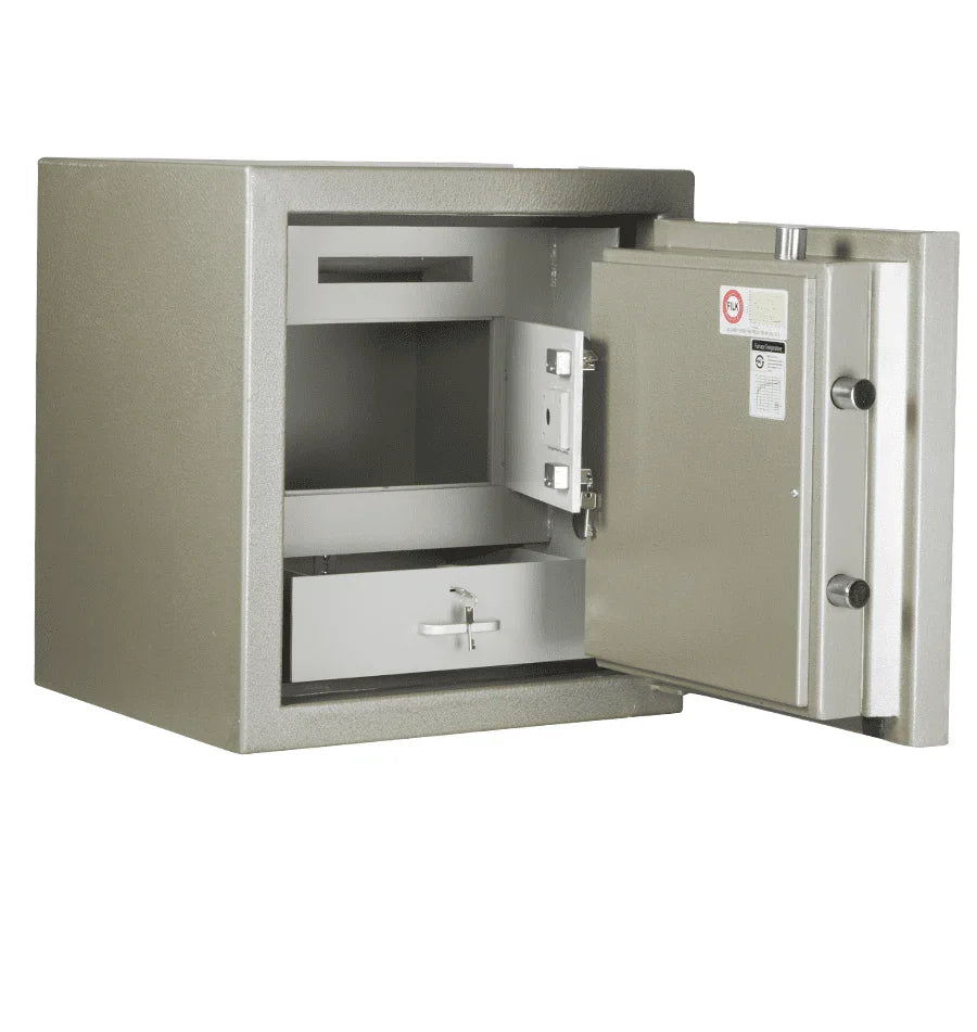 - Internal envelope type deposit posting slot dropping directly into a pick resistant dual lockable inner custody key compartment