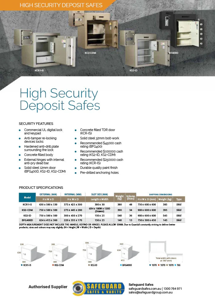 - The KCR Deposit Safes provides ultimate protection and resistance against all known forms of professional attack by such means as oxy-Acetylene, high-speed drills and grinders, explosives and force, pneumatic and hydraulic power tools, crowbars and sledge hammers etc, and industrial cutting tools
