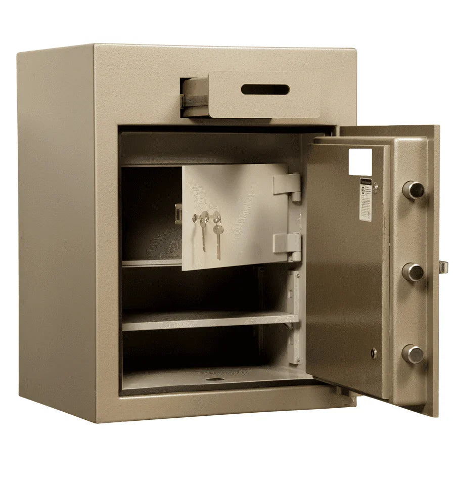 - Heavy duty deposit chute dropping directly into a pick resistant lockable dual key inner custody compartment
